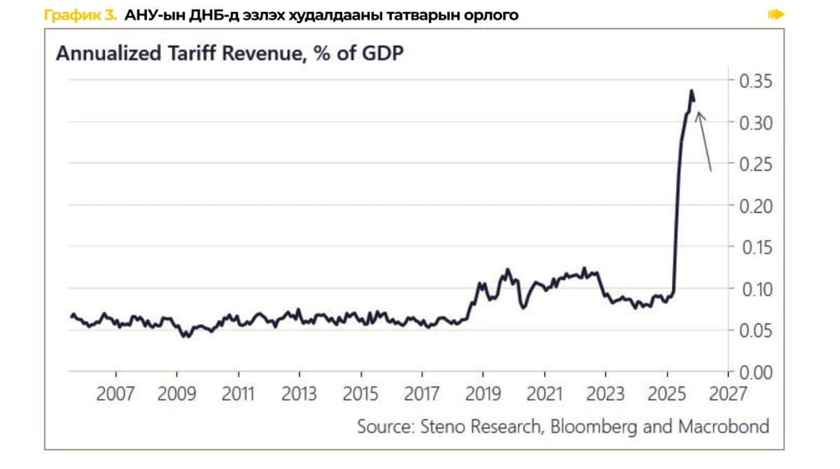 Трампын Засаг захиргаанаас 4 сард шинээр зарласан нэмэгдсэн тарифын нөлөөлөлтэйгөөр сүүлийн 12 сарын тарифын орлого ДНБ-д эзлэх хувь түүхэн дээд хэмжээндээ хүрлээ.